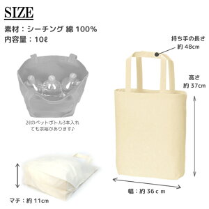 薄手ではありますが、約11cmのマチがあるので大容量!!! なんと、2リットルのペットボトルが、 3本も入るのです!!! また、薄手のバッグなので、折りたたむととってもコンパクト。